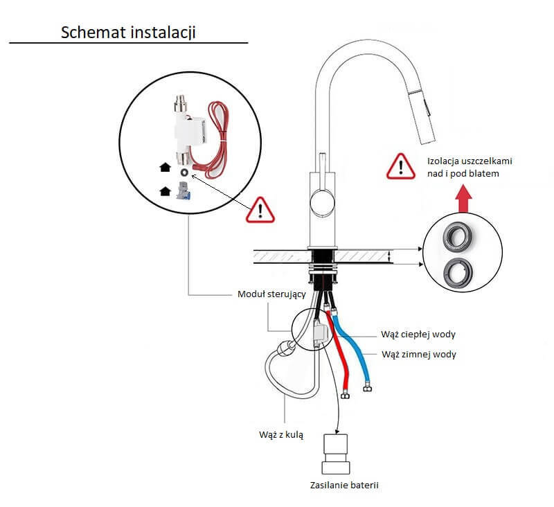 Zestaw zawiera: – zasilanie czujnika na baterie (IP44) – bateria – uszczelki – węże zasilające do podpięcia wody – instrukcja montażu po polsku Uwaga dotycząca działania – każde dotknięcie uruchamia lub wyłącza dopływ wody.