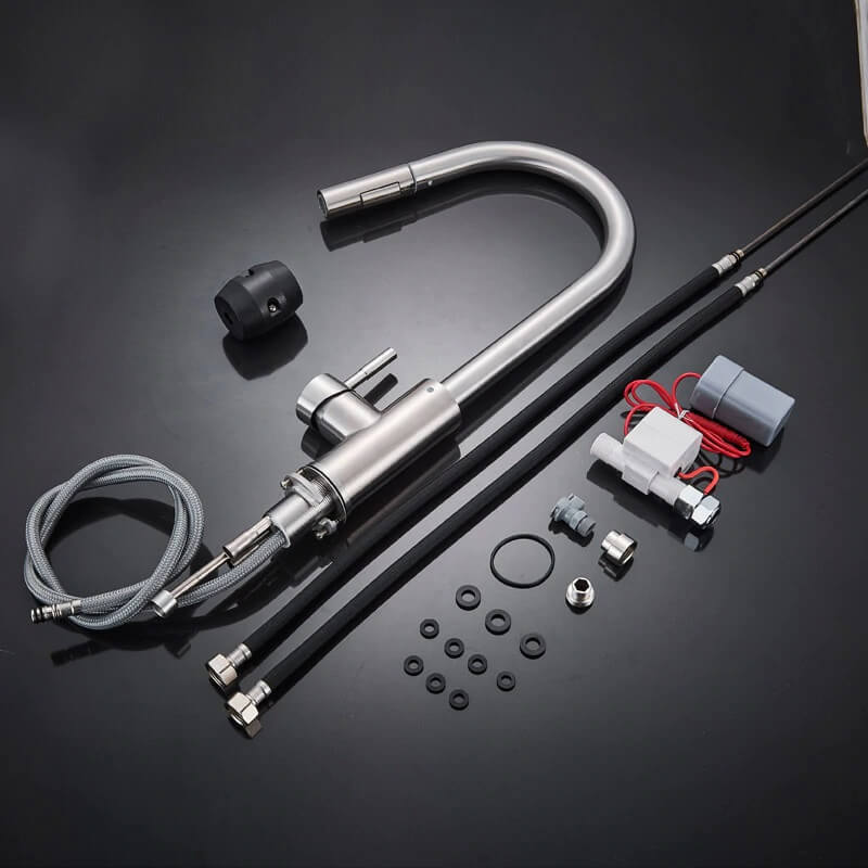 Zestaw zawiera: – zasilanie czujnika na baterie (IP44) – bateria – uszczelki – węże zasilające do podpięcia wody – instrukcja montażu po polsku Uwaga dotycząca działania – każde dotknięcie uruchamia lub wyłącza dopływ wody.
