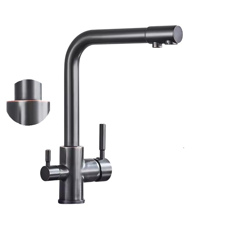 Nowoczesna, elegancka dwufunkcyjna bateria trójdrożna z podłączeniem do wody ciepłej i zimnej z sieci, dodatkowe trzecie podłączenie do wody filtrowanej z filtra do wody.