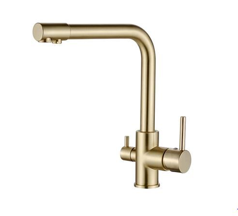 Nowoczesna, elegancka dwufunkcyjna bateria trójdrożna z podłączeniem do wody ciepłej i zimnej z sieci, dodatkowe trzecie podłączenie do wody filtrowanej z filtra do wody.