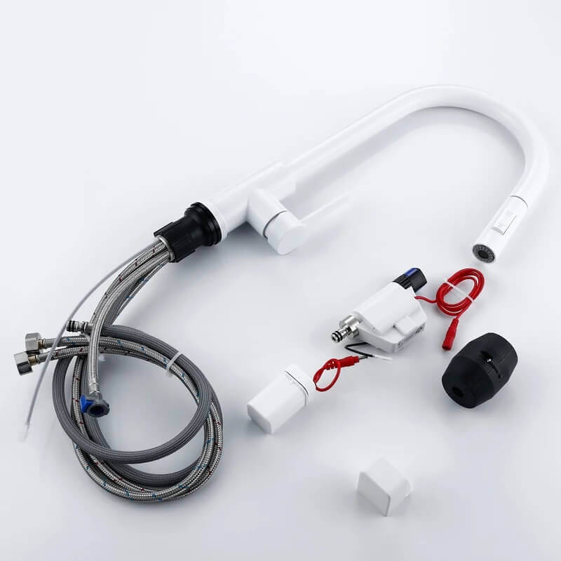 Zestaw zawiera: – zasilanie czujnika na baterie (IP44) – bateria – uszczelki – węże zasilające do podpięcia wody – instrukcja montażu po polsku Uwaga dotycząca działania – każde dotknięcie uruchamia lub wyłącza dopływ wody.