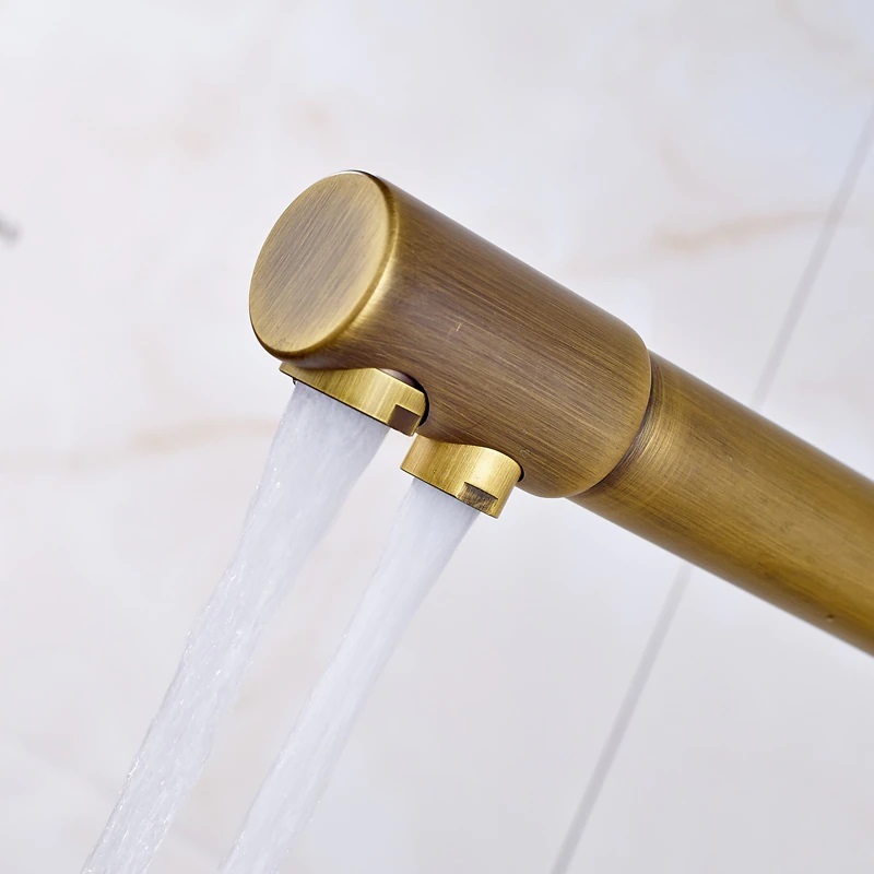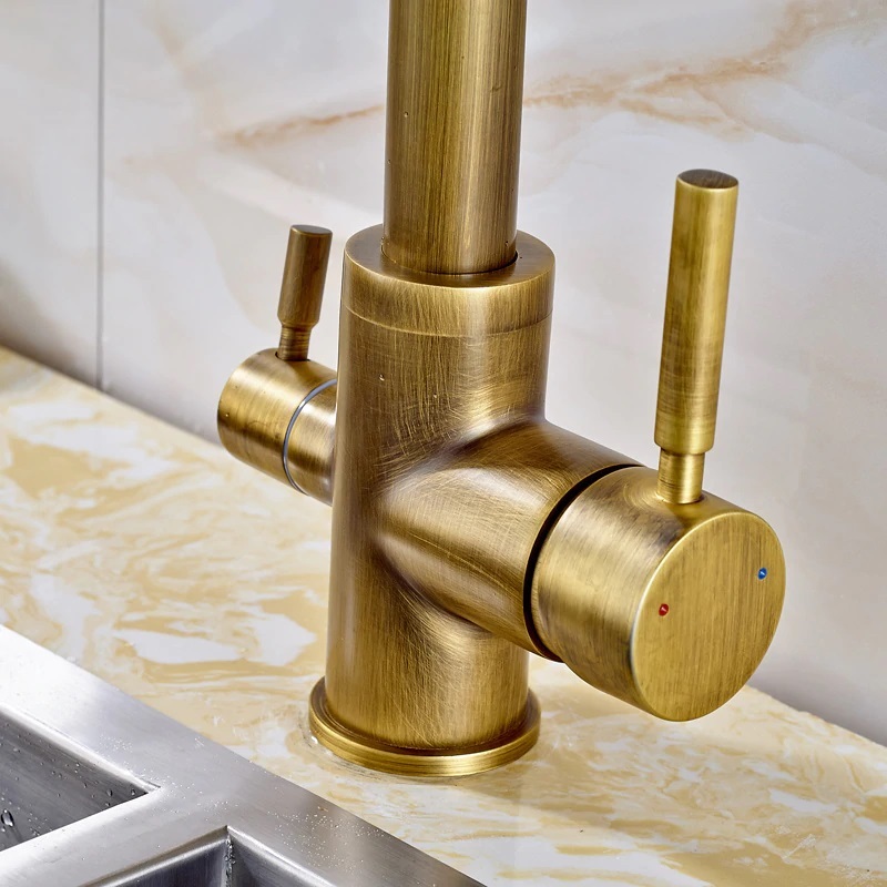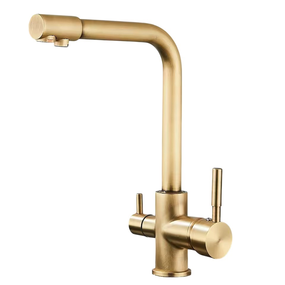 Nowoczesna, elegancka dwufunkcyjna bateria trójdrożna z podłączeniem do wody ciepłej i zimnej z sieci, dodatkowe trzecie podłączenie do wody filtrowanej z filtra do wody.