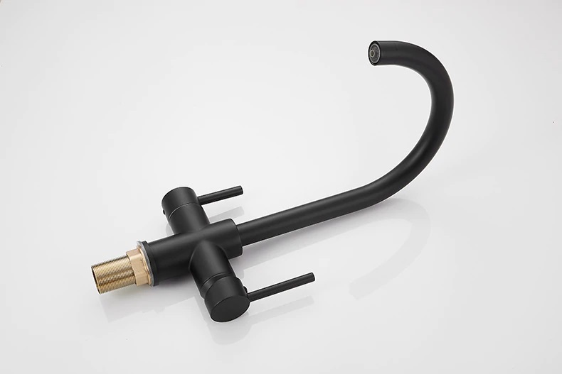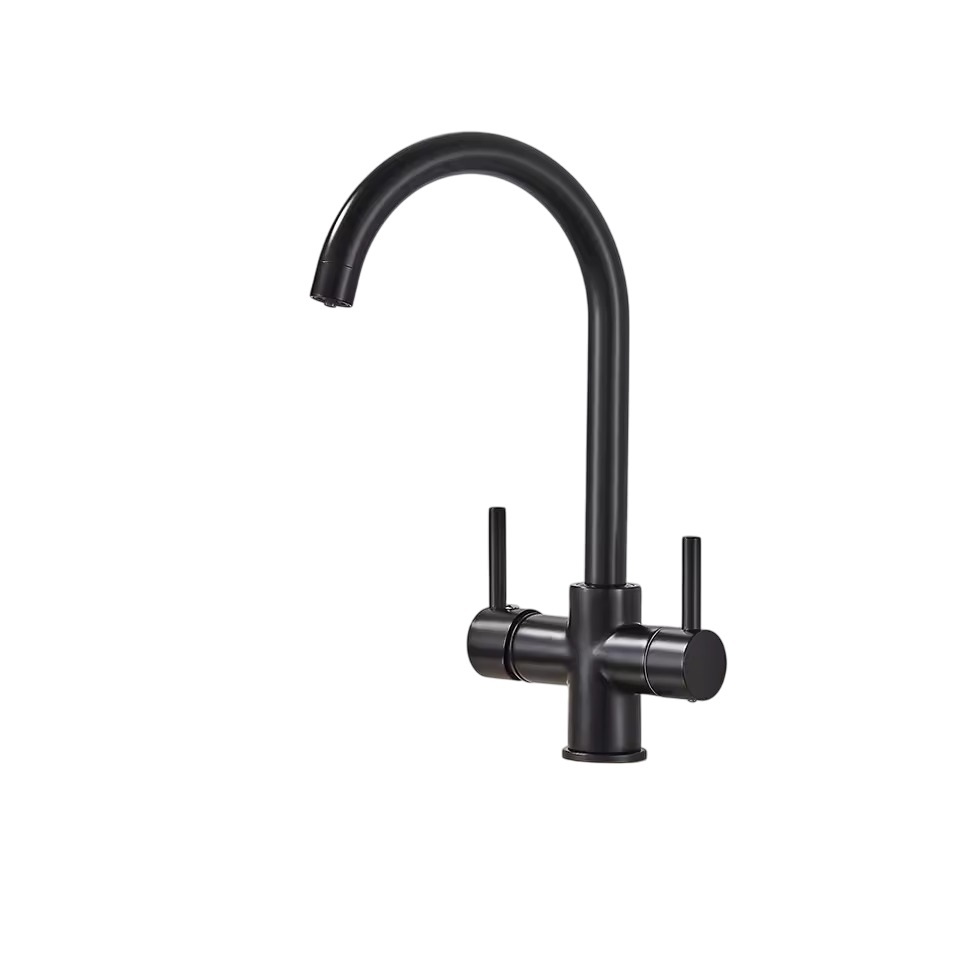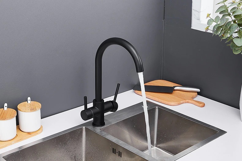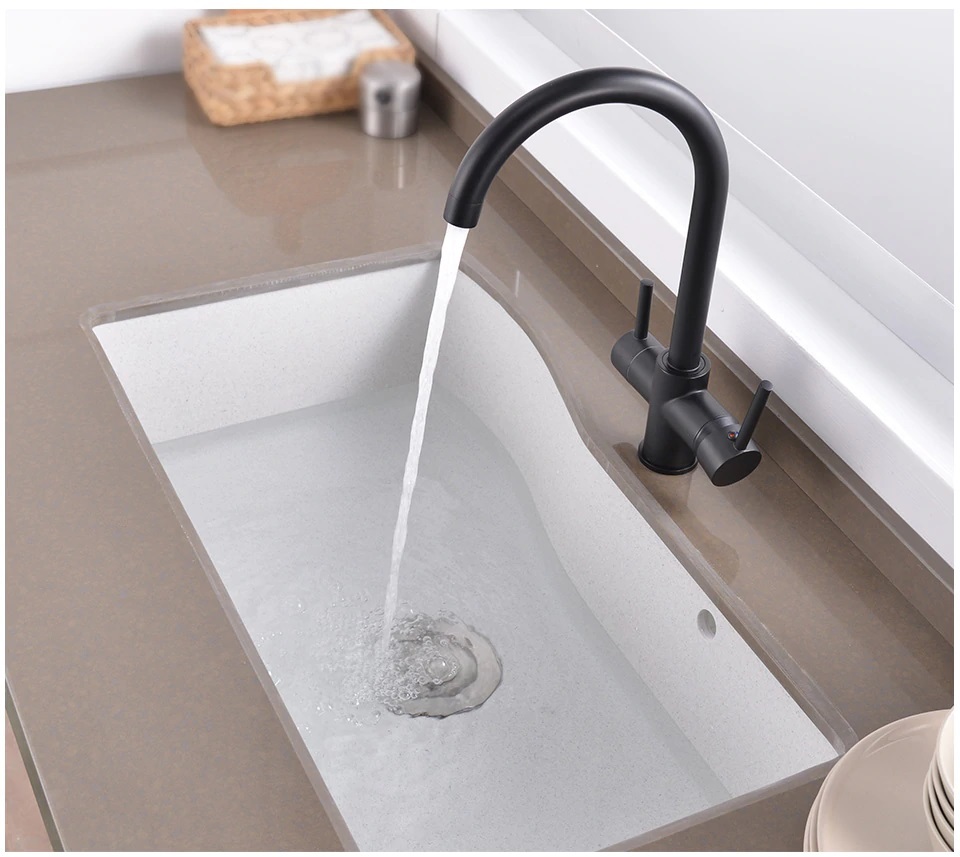 Nowoczesna, elegancka dwufunkcyjna bateria trójdrożna z podłączeniem do wody ciepłej i zimnej z sieci, dodatkowe trzecie podłączenie do wody filtrowanej z filtra do wody.