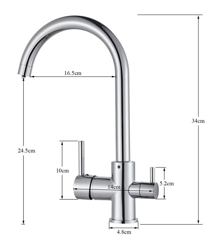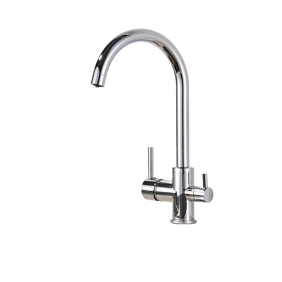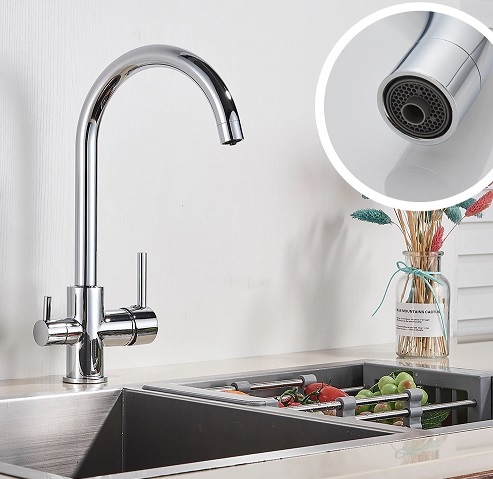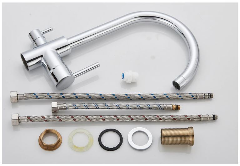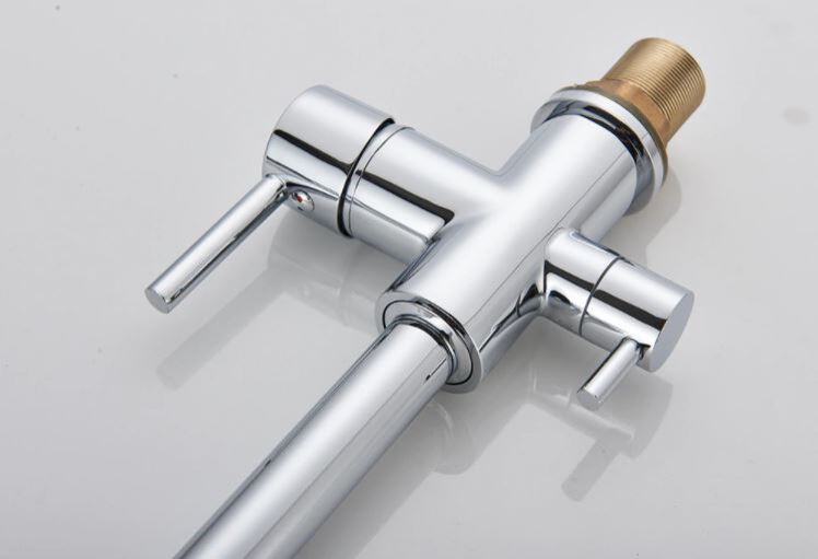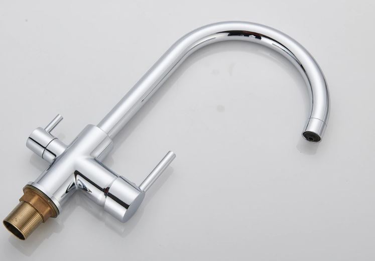 Nowoczesna, elegancka dwufunkcyjna bateria trójdrożna z podłączeniem do wody ciepłej i zimnej z sieci, dodatkowe trzecie podłączenie do wody filtrowanej z filtra do wody.