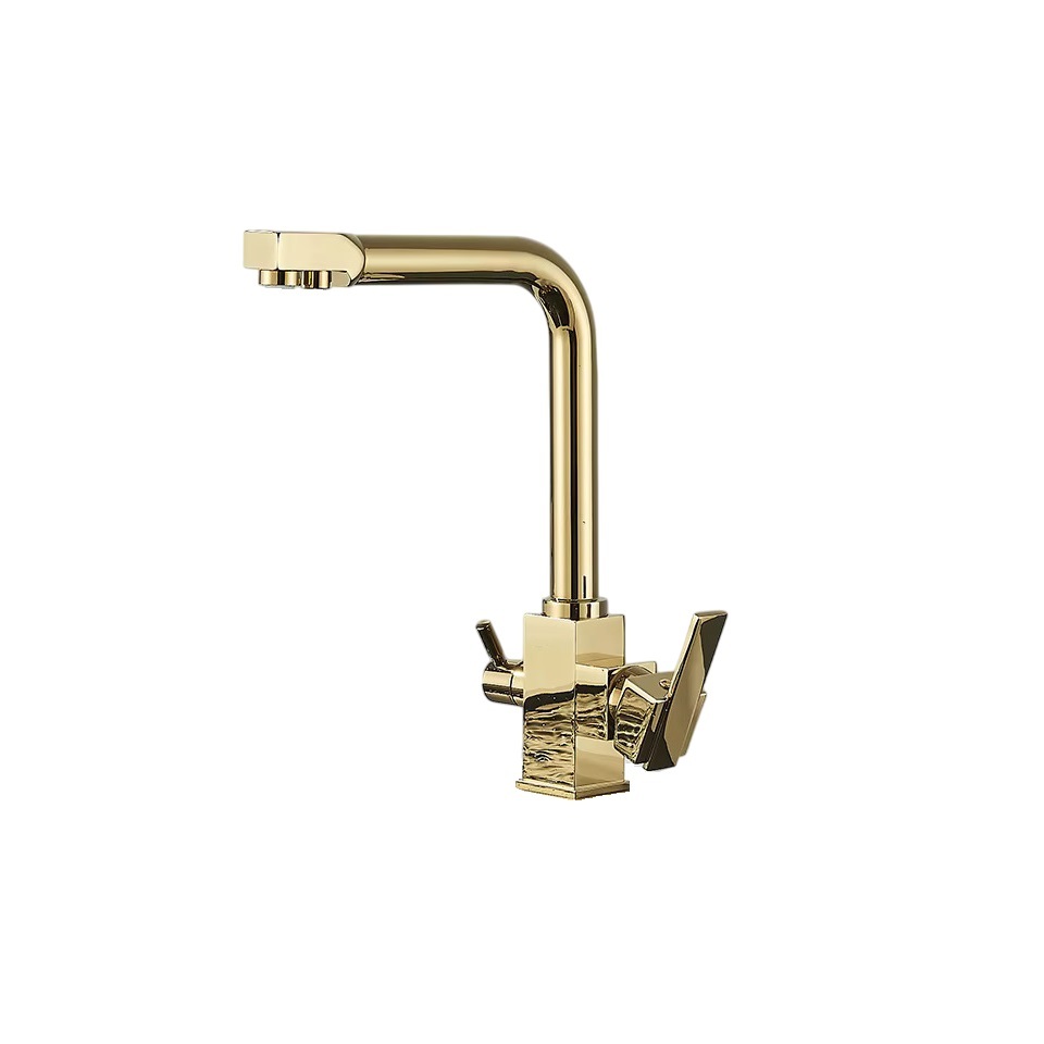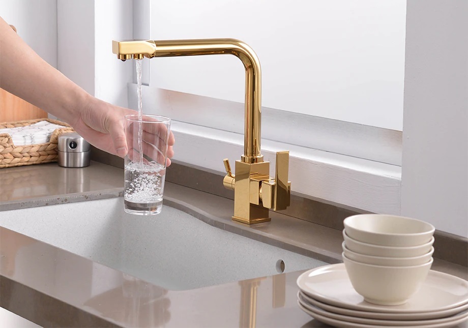 Nowoczesna, elegancka dwufunkcyjna bateria trójdrożna z podłączeniem do wody ciepłej i zimnej z sieci, dodatkowe trzecie podłączenie do wody filtrowanej z filtra do wody.
