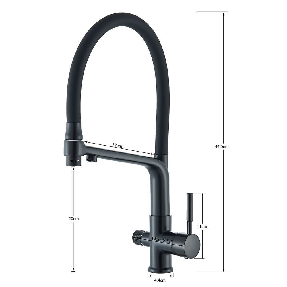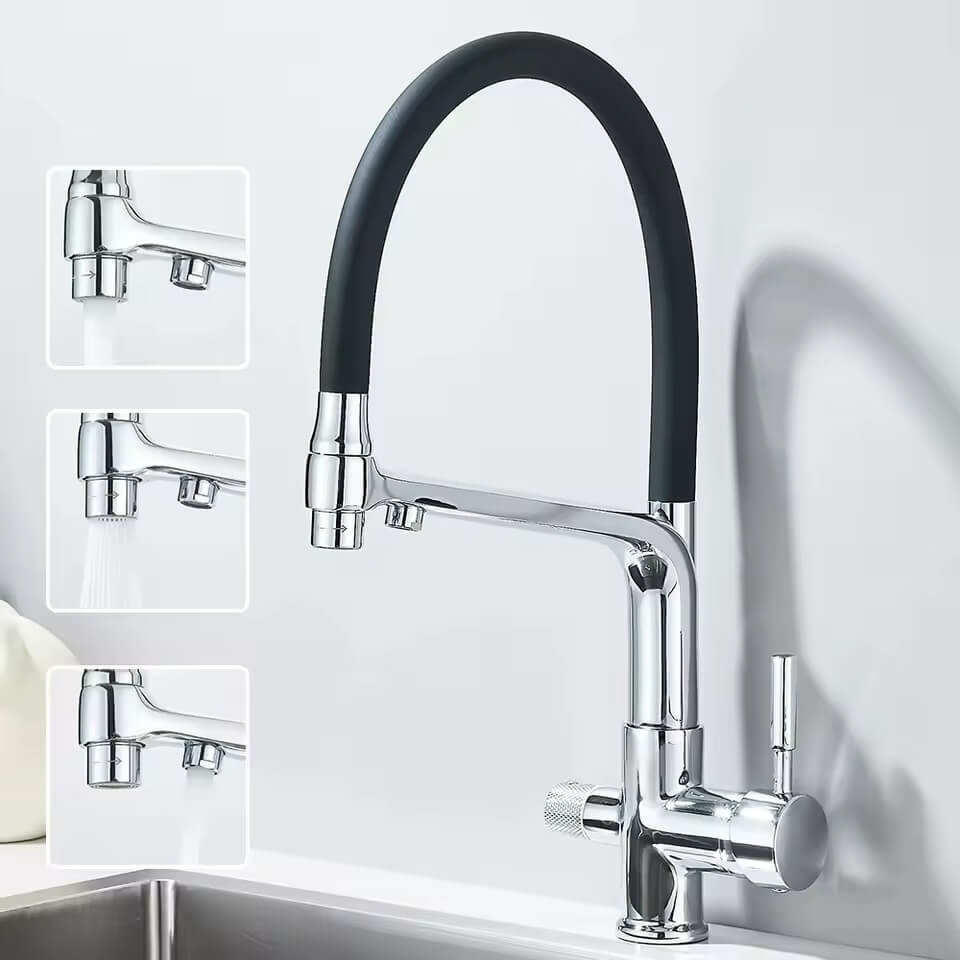 Nowoczesna, elegancka dwufunkcyjna bateria trójdrożna z podłączeniem do wody ciepłej i zimnej z sieci, dodatkowe trzecie podłączenie do wody filtrowanej z filtra do wody.