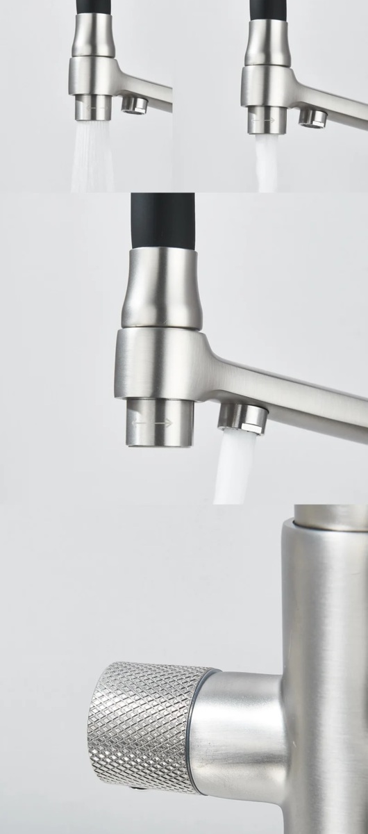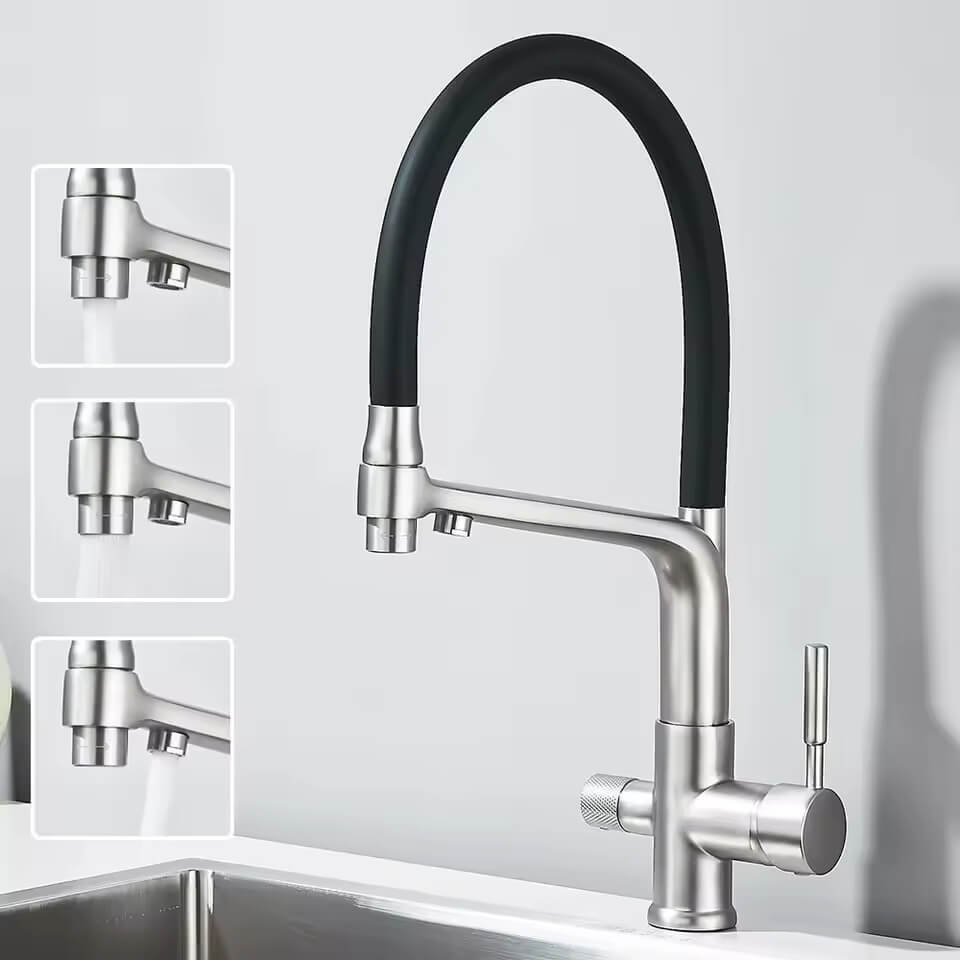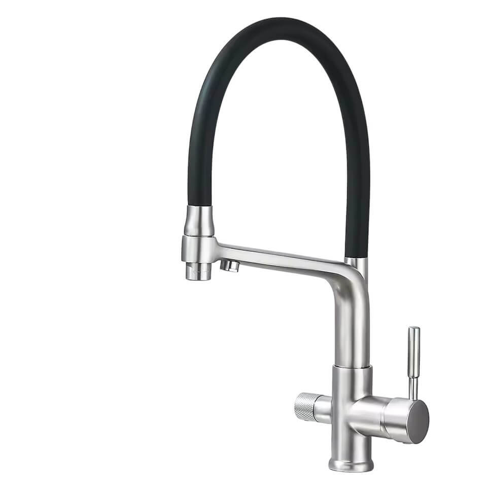 Nowoczesna, elegancka dwufunkcyjna bateria trójdrożna z podłączeniem do wody ciepłej i zimnej z sieci, dodatkowe trzecie podłączenie do wody filtrowanej z filtra do wody.
