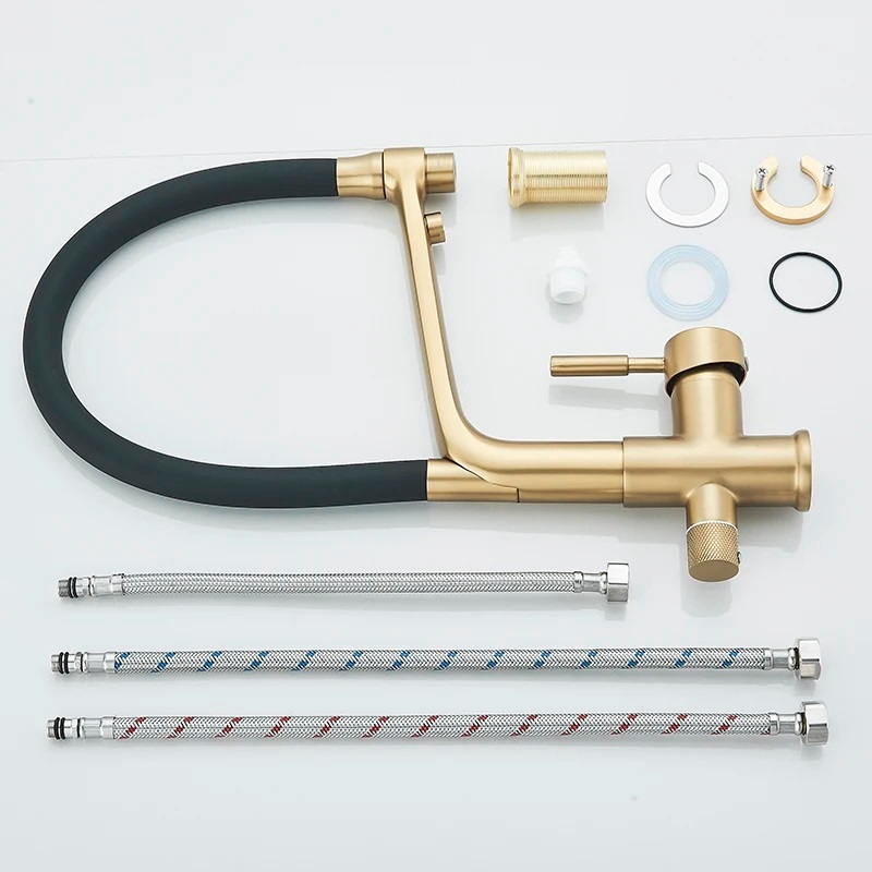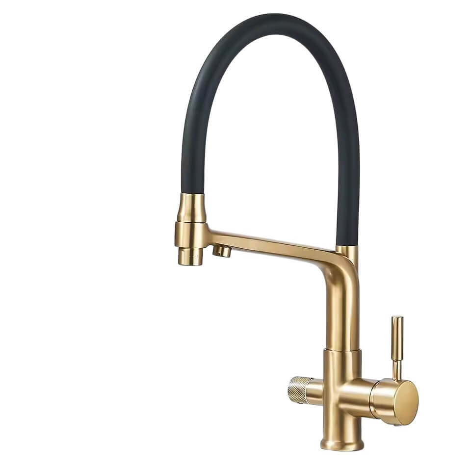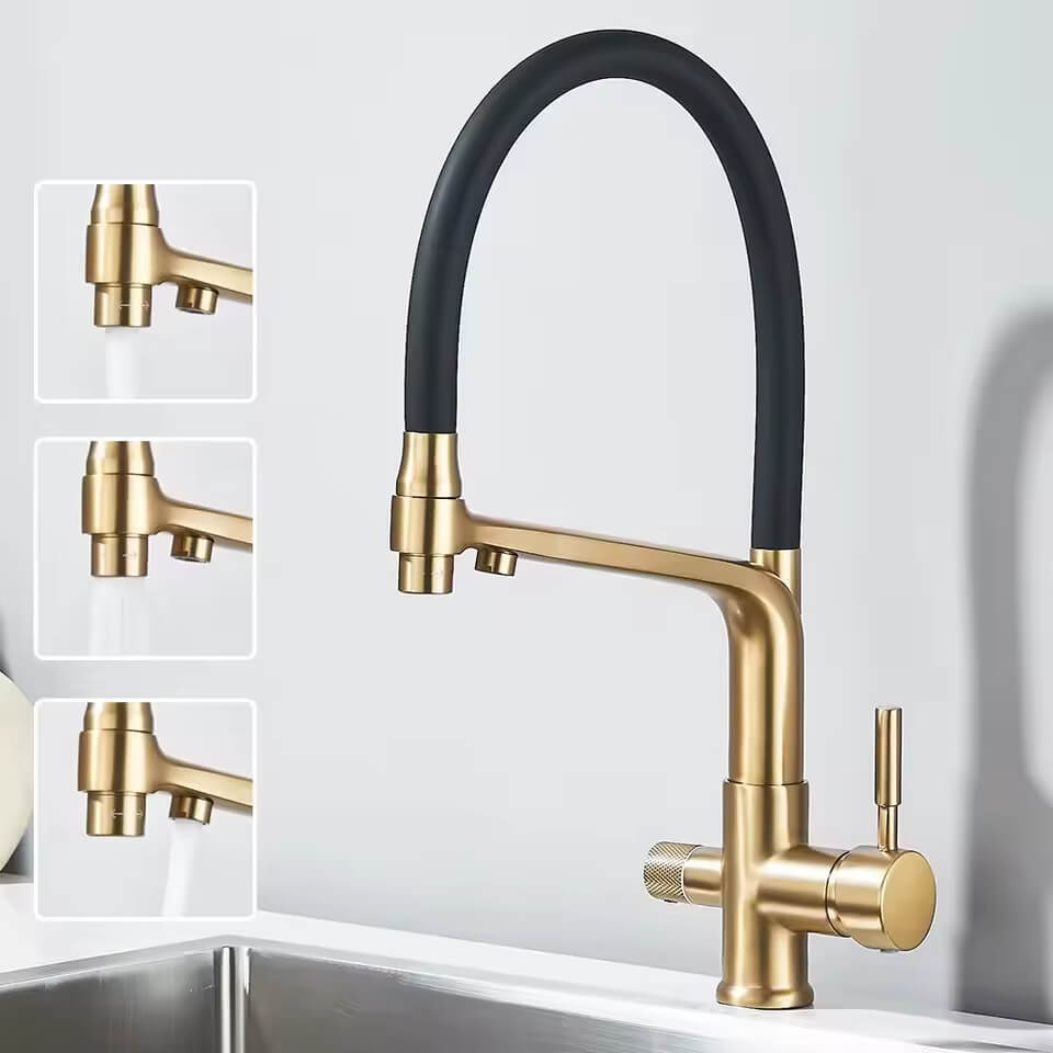 Nowoczesna, elegancka dwufunkcyjna bateria trójdrożna z podłączeniem do wody ciepłej i zimnej z sieci, dodatkowe trzecie podłączenie do wody filtrowanej z filtra do wody.